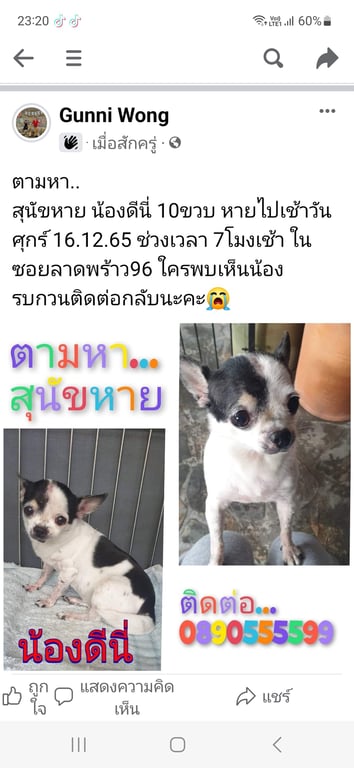รอยตำหนิ: ลายดำขาว มีแผลกลางหน้าผากตามหา.. สุนัขหาย น้องดีนี่ 10ขวบ หายไปเช้าวันศุกร์ 16.12.65 ช่วงเวลา 7โมงเช้า ในซอยลาดพร้าว96 ใครพบเห็นน้อง รบกวนติดต่อกลับนะคะ😭