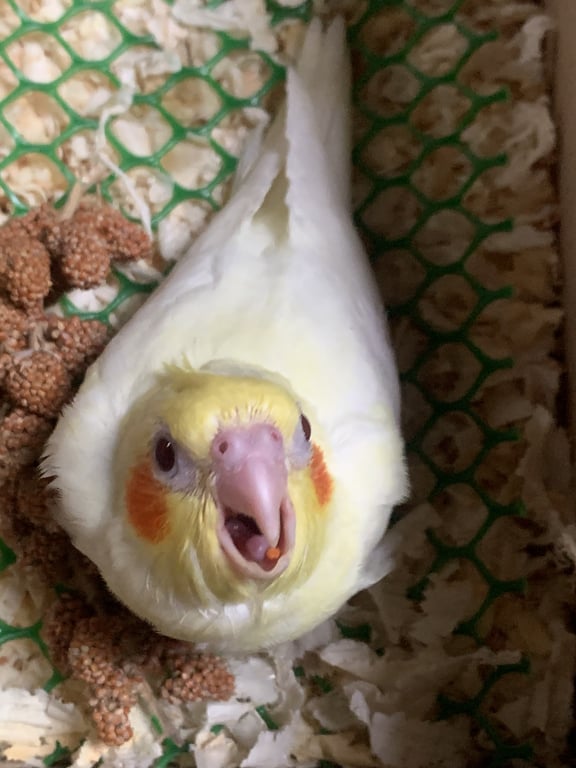 รอยตำหนิ: ปีกสีขาว มีจุแต้มเหลืองเป็นแถบ ตอนหลุดน้องใส่ผ้าอ้อมนกไว้
