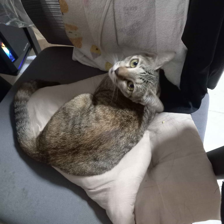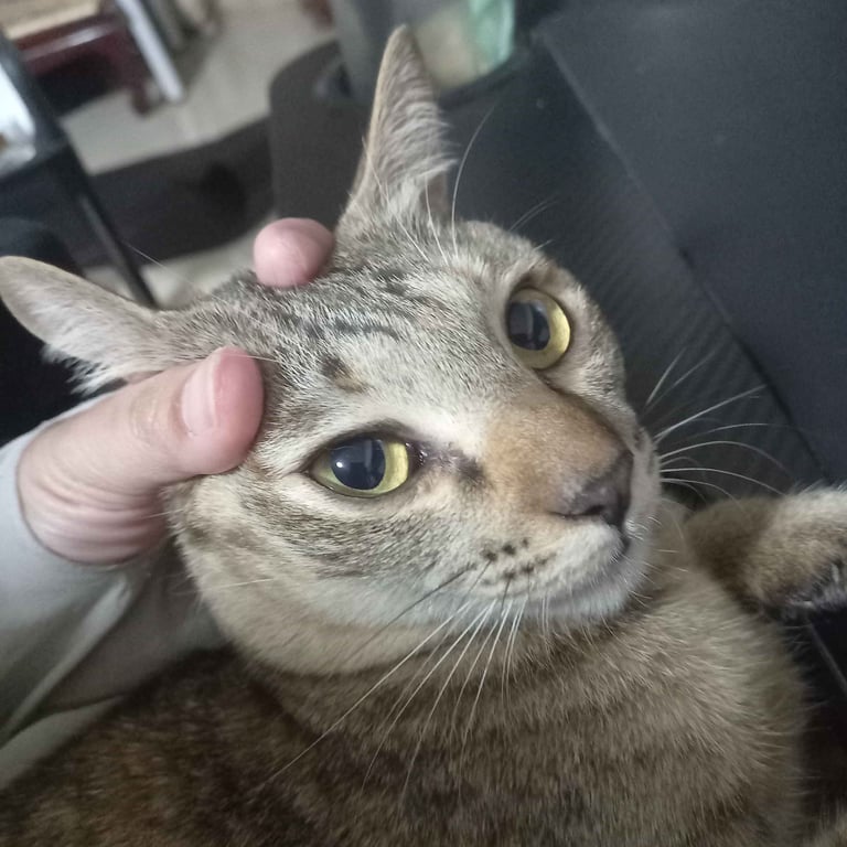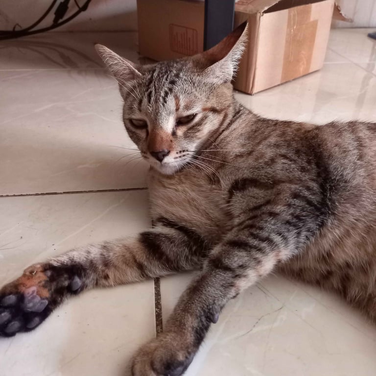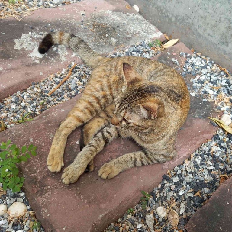 รอยตำหนิ: ลายสลิดสีออกเหลือง ๆ หางยาวปลายดำ ตาสีเหลือง จมูกดำ เสียงหวานมากถ้ามีอาหารจะชอบหาคน ถ้าสนิทกันจะติดดูดเสื้อ วิ่งไว ชอบกระดิกเฉพาะปลายหางช่วงปลายสีดำ