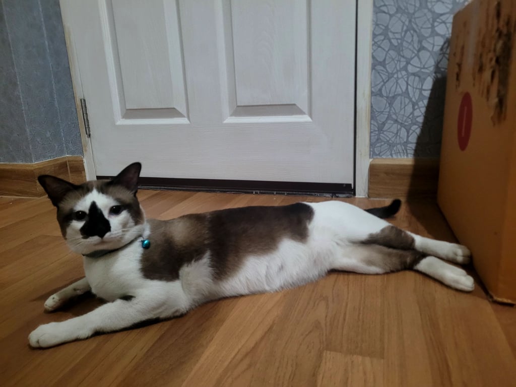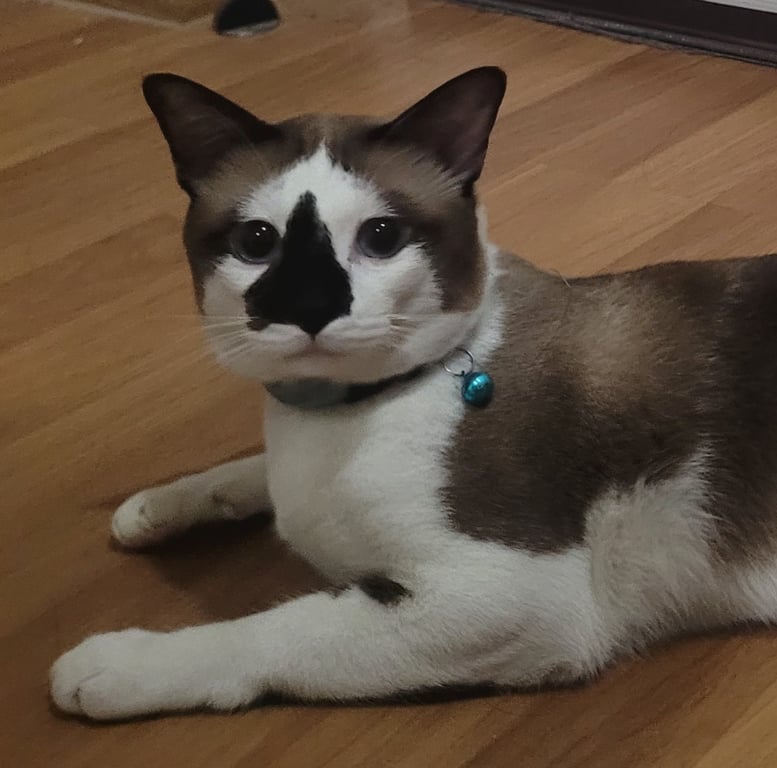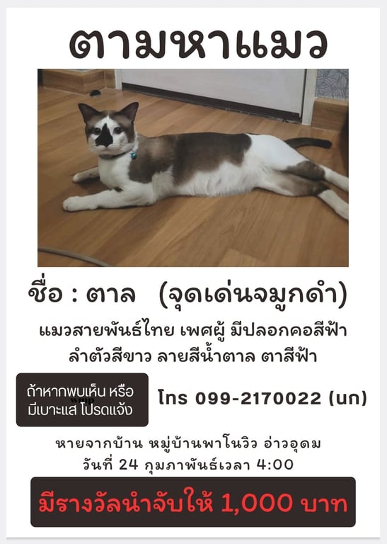 รอยตำหนิ: จมูกดำ ลำตัวสีขาวมีลายน้ำตาล ตาสีฟ้า ปลอกคอสีฟ้าขี้อ้อน ติดคน ซน อยากรู้อยากเห็นกำลังเข้าวัยรุ่น มีร้องบ้าง