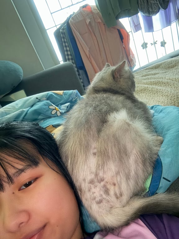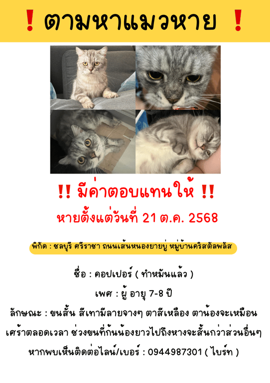 รอยตำหนิ: หน้าท้องส่วนล่างมีรอยผ่าตัด ( ขนไม่ขึ้น ) ช่วงท้ายตรงส่วนหางขนจะหายไปไม่กัดคน ขี้ระแวงแต่ไม่ข่วน เสียงแหบ