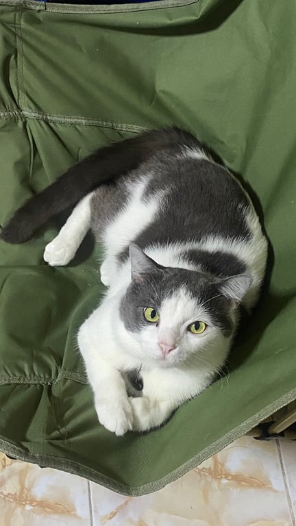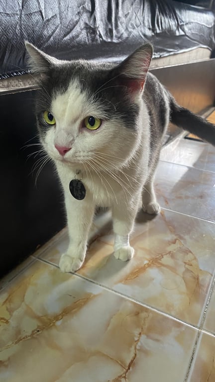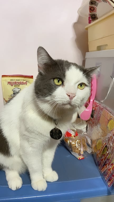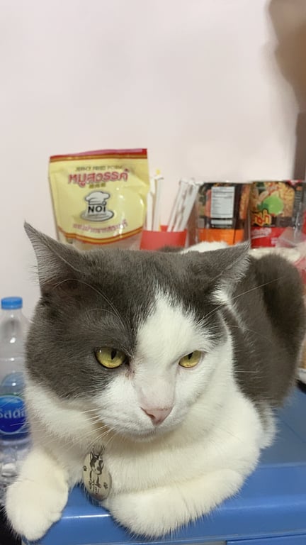 รอยตำหนิ: ตรงหน้าเป็นแสกสามเหลี่ยมสีขาวเทาค่ะ ตาสีเหลืองขี้กลัว ขี้ระแวง