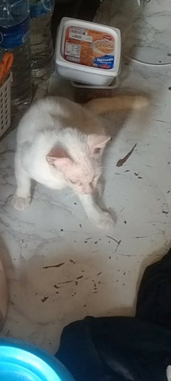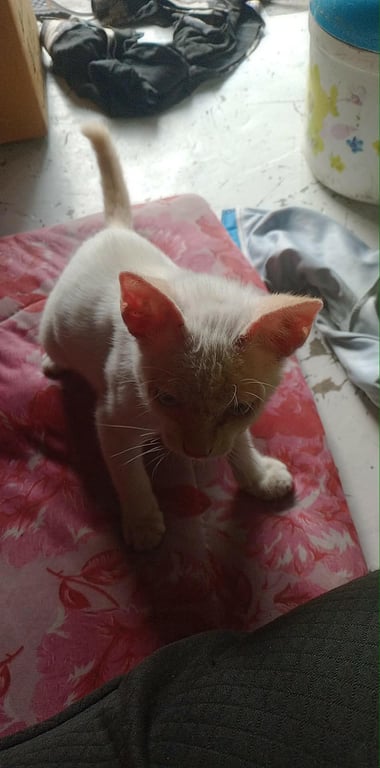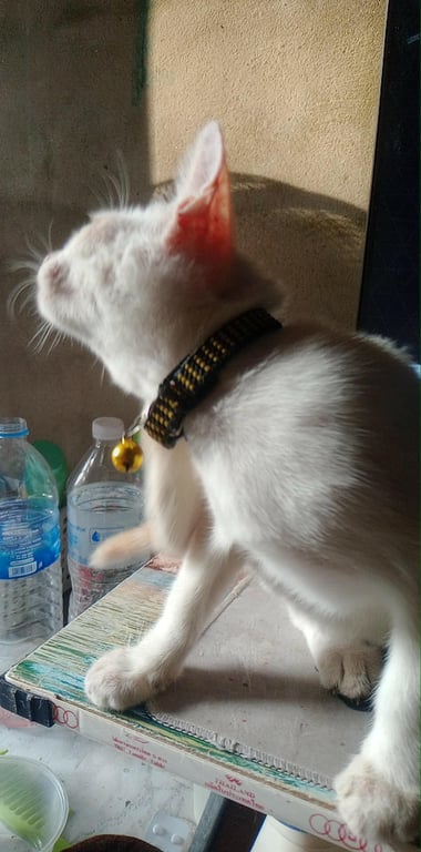 รอยตำหนิ: ตาสีฟ้า หูมีสะเก็ดเชื้อรา หัวบวมหน่อย หางมีปนส้มติดเล่น ขี้อ้อน มีความขี้กลัวนิดหน่อยเพราะเป็นแมวจร จะเป็นแมวไม่เข้าใกล้คนแปลกหน้าถ้าไม่มีพ่อหรือแม่อยู่ชอบซ่อนตัว
