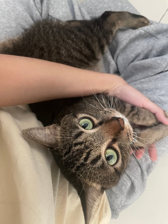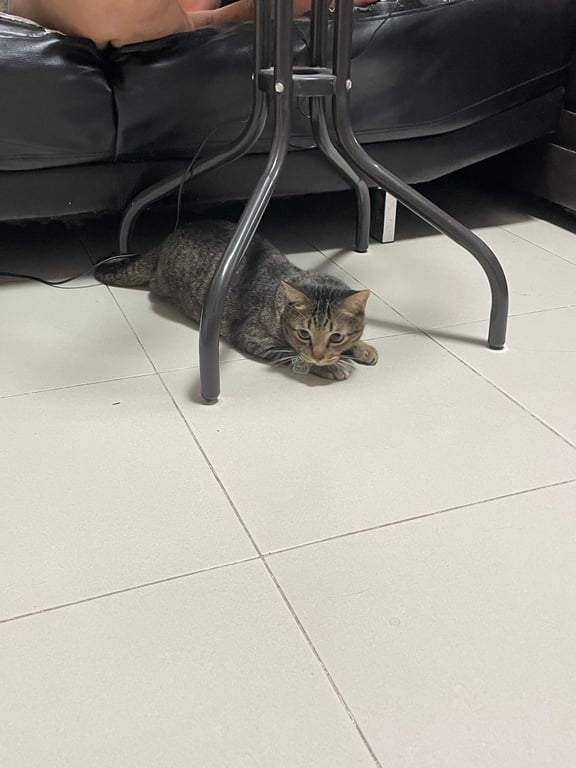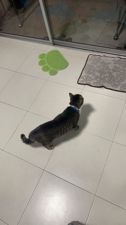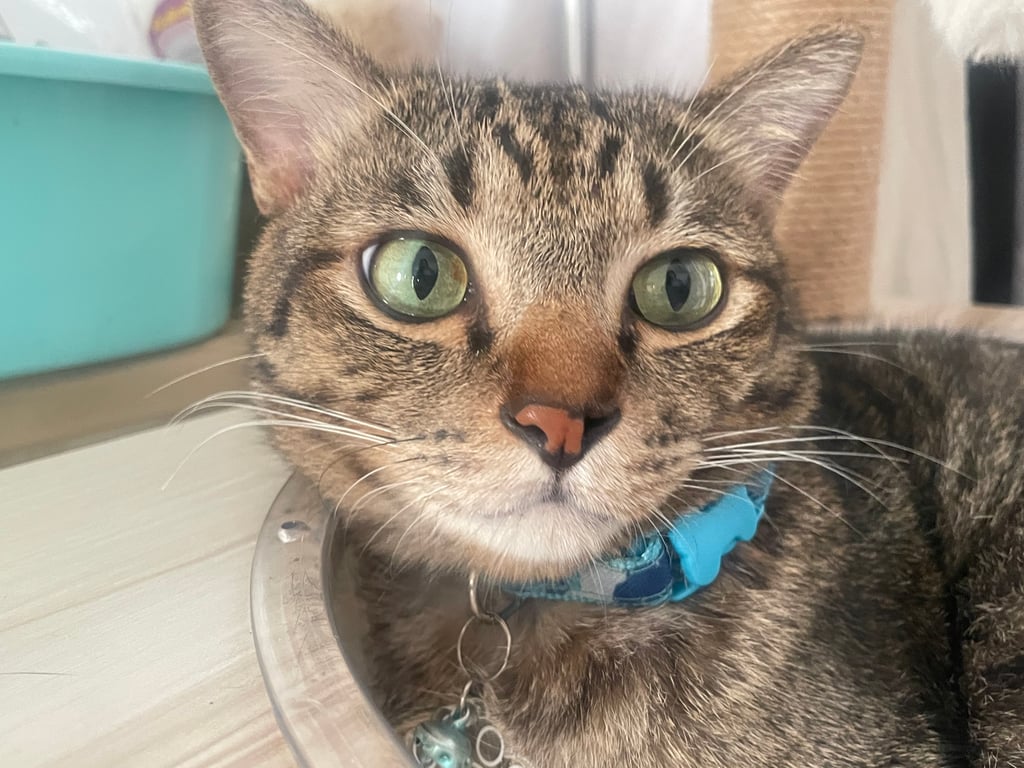 รอยตำหนิ: จมูกแหว่ง 1 ข้าง, หางยาว, ใส่ปลอกคอผ้าสีฟ้ามีป้ายชื่อขี้กลัว
