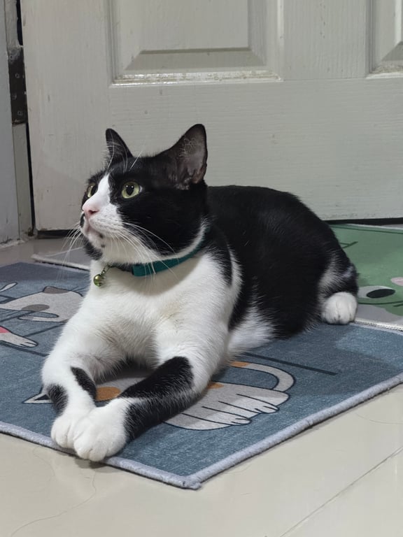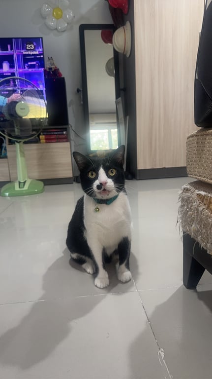 รอยตำหนิ: มีรอยปื้นสีดำข้างรูจมูก เหมือนไฝ หางกุดสั้น ใต้คางมีจุดสีดำ3จุดขี้กลัวคน ไม่ดุร้าย