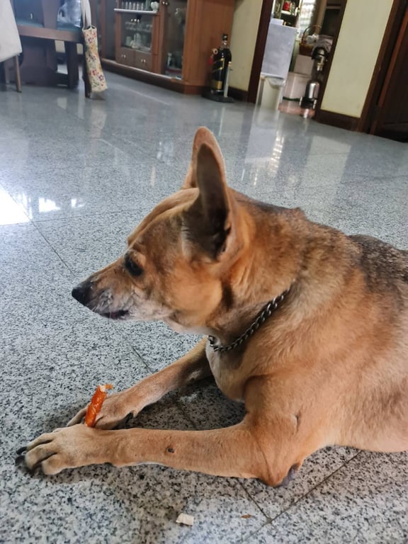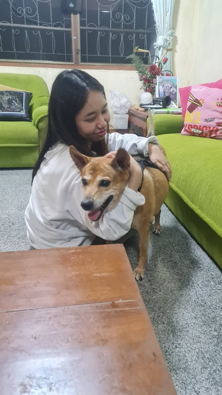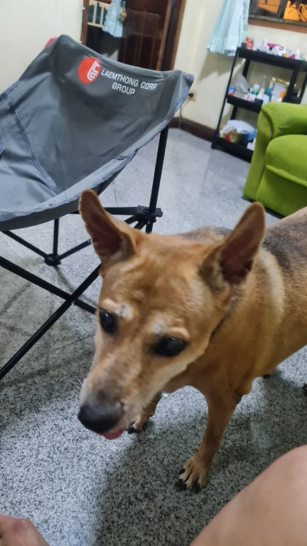 รอยตำหนิ: เนื้องอดที่อก 2ก้อน และ แผลเป็นสามเหลี่ยมขาหน้าซ้ายน่องอายุ15 ปี ตาขุ่น 2ข้าง แต่ยังพอมองเห็น ร่าเริ่ง