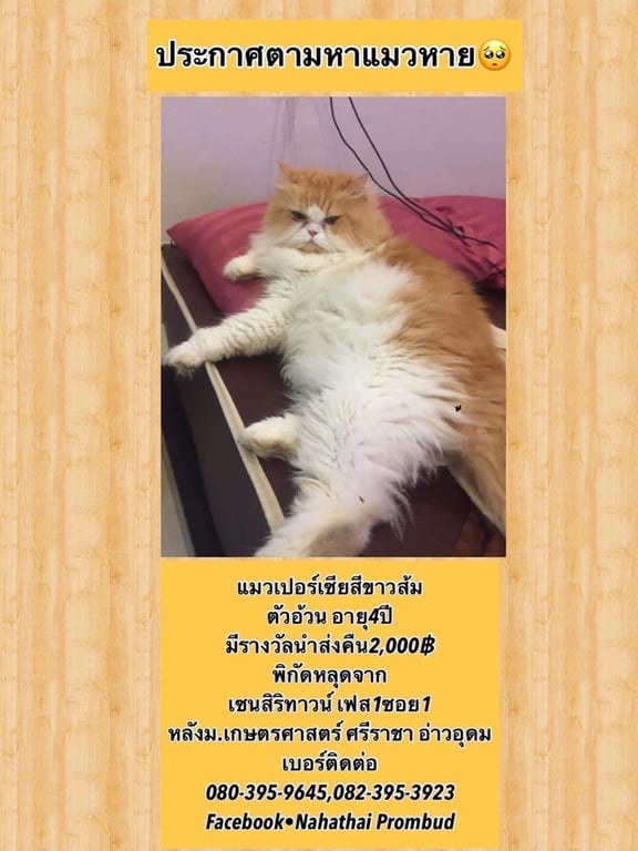 รอยตำหนิ: ตัวอ้วนหนัก 4.5 โลหายตั้งแต่วันที่ 13/12/65 ตอนนี้ยังไม่เจอเลย บริเวณอ่าวอุดม หมู่บ้านเซนสิริ 1