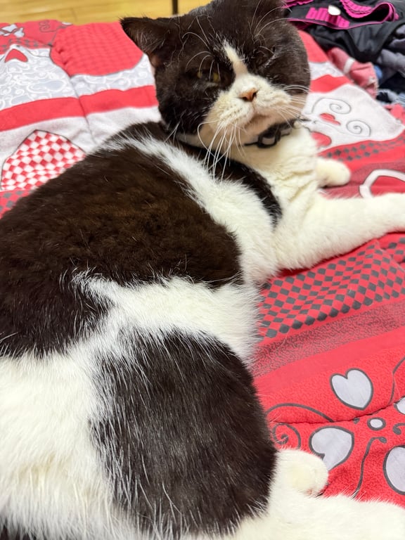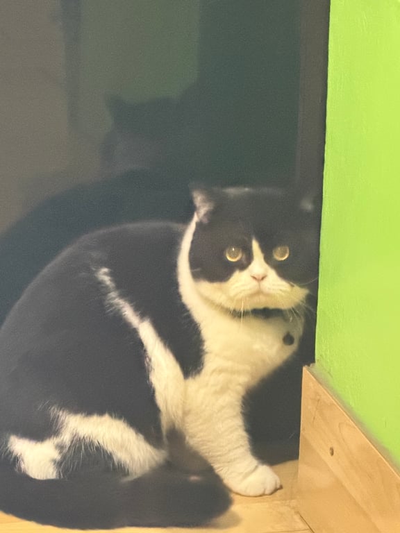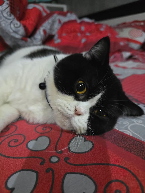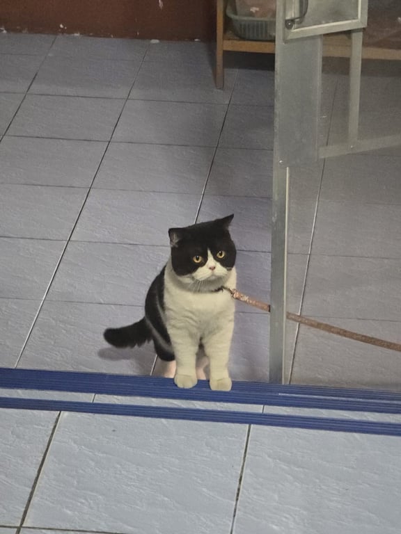 รอยตำหนิ: เป็นแมวลายวัว ตัวอ้วน หน้าตาเหมือนใส่หมวกดำ จมูกจนถึงคอเป็นสีขาว ขาหน้าสีขาวเกลี้ยง หลังมีสีดำสะส่วนใหญ่ หางสีดำล้วน ใส่ปลอกคอสีเงิน กระดิ่งสีดำขี้สงสัย แต่ก็กลัวคน ชอบแอบ ไม่ค่อยส่งเสียง