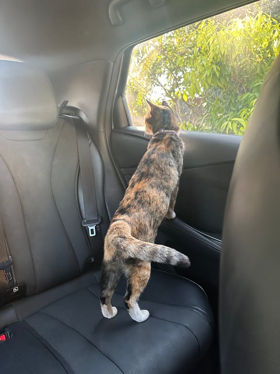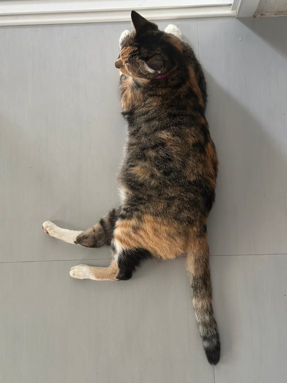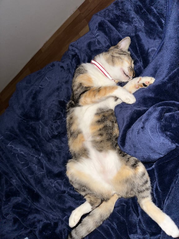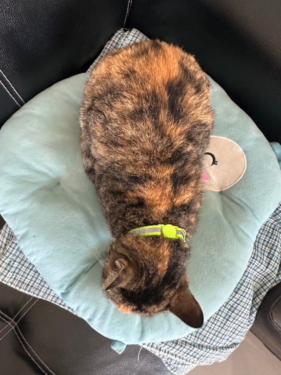 รอยตำหนิ: อกและใต้ท้องมีขนสีขาวแมวลายสลิด ที่มีขนสีขาวที่อกและใต้ท้อง และบริเวณเท้าบางส่วน หางยาว ใส่ปลอกคอสีเขียวมีแถบเรืองแสง