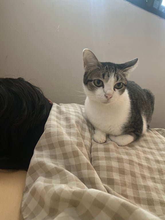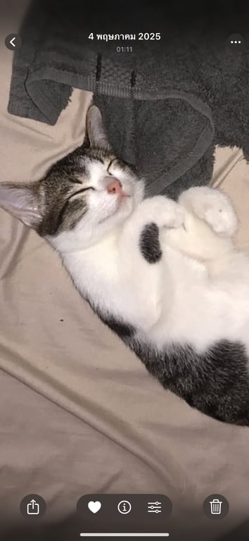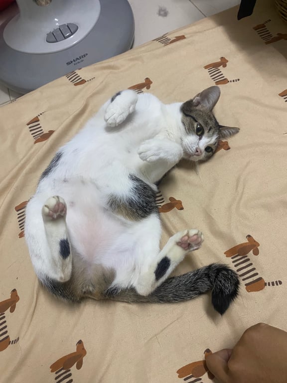 รอยตำหนิ: ขาหน้าขวา มีลายของน้องเป็นปานกลมๆ แขนซ้ายใส่เสื้อคลุมไหล่แขนสั้น หัว กับ ตัวส่วนหลัง มีสีขาวกั้นลายขี้กลัวนิดๆ แต่อ้อน เป็นมิตร ถ้าเรียกแล้วจะมาหา เสียงเล็กๆ ร้องสั้นๆ น้องตัวค่อนข้างเล็กกว่าแมวตัวเมียทั่วไป เวลาอุ้มจะเหมือนหมา ไม่ค่อยย้วย