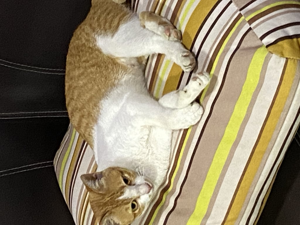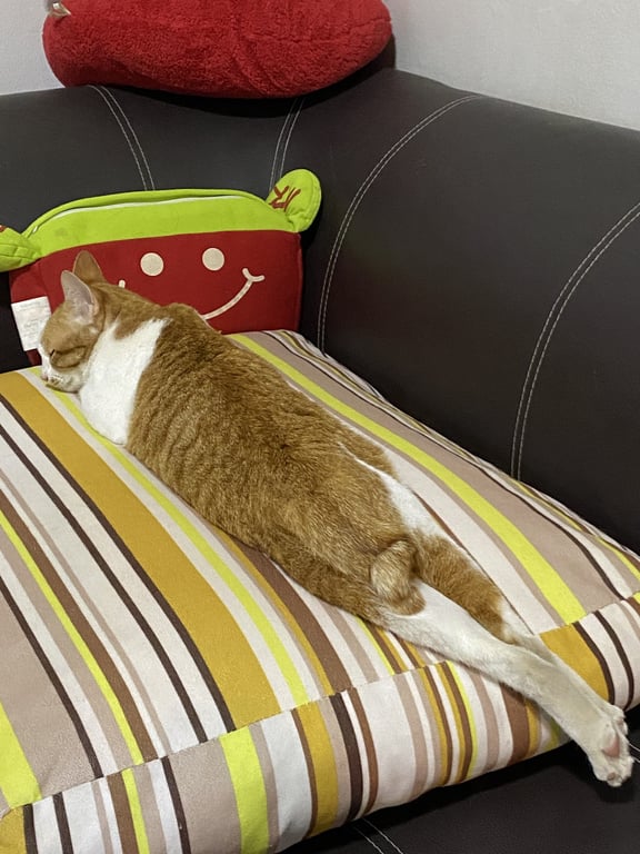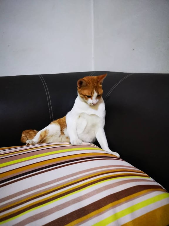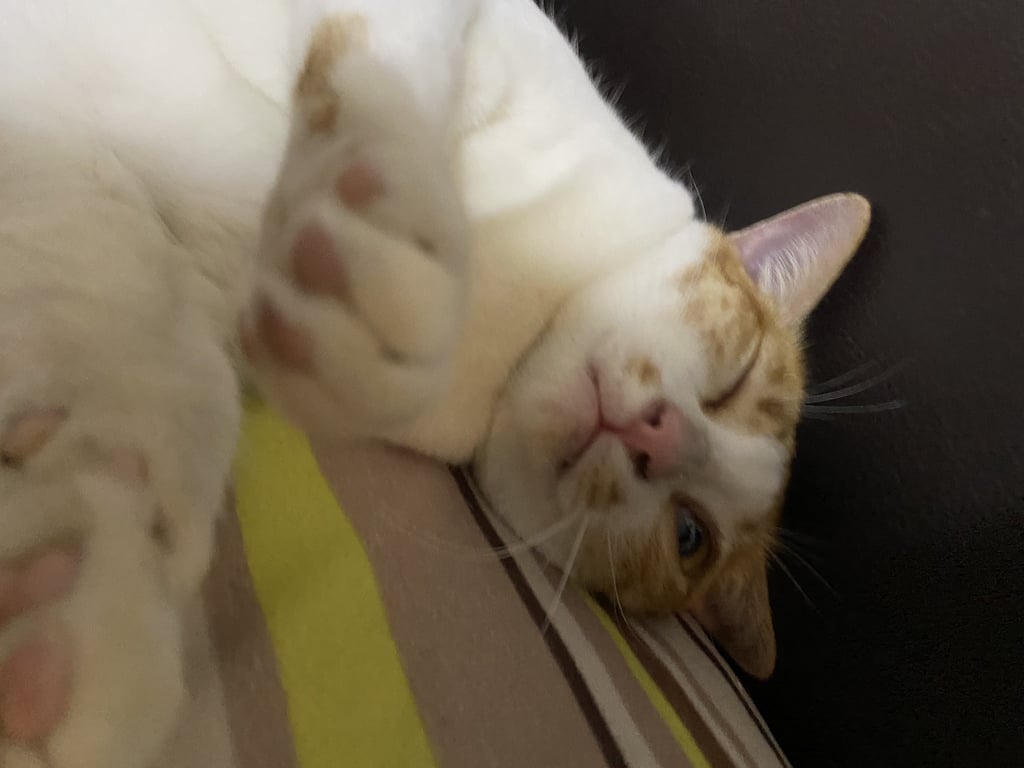 รอยตำหนิ: หางขอด มีแต้มจุดสีสัมตรงข้างจมูกสองข้าง กับที่ล่างปาก ขาเจ็บ