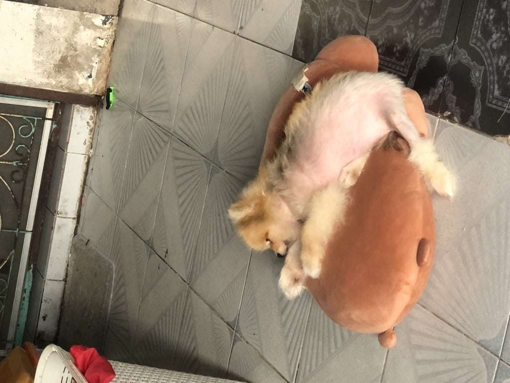รอยตำหนิ: ขาข้างหลังกับหน้าอกไม่มีขน มีขนตรงช่วงเท้าน้องหมา ใส่เสื้อสีน้ำเงินชายเสื้อสีส้มเป็นระบาย ขาไม่ค่อยมีขนกับหน้าท้องและช่วงอก เป็นปอมพันธุ์เล็ก