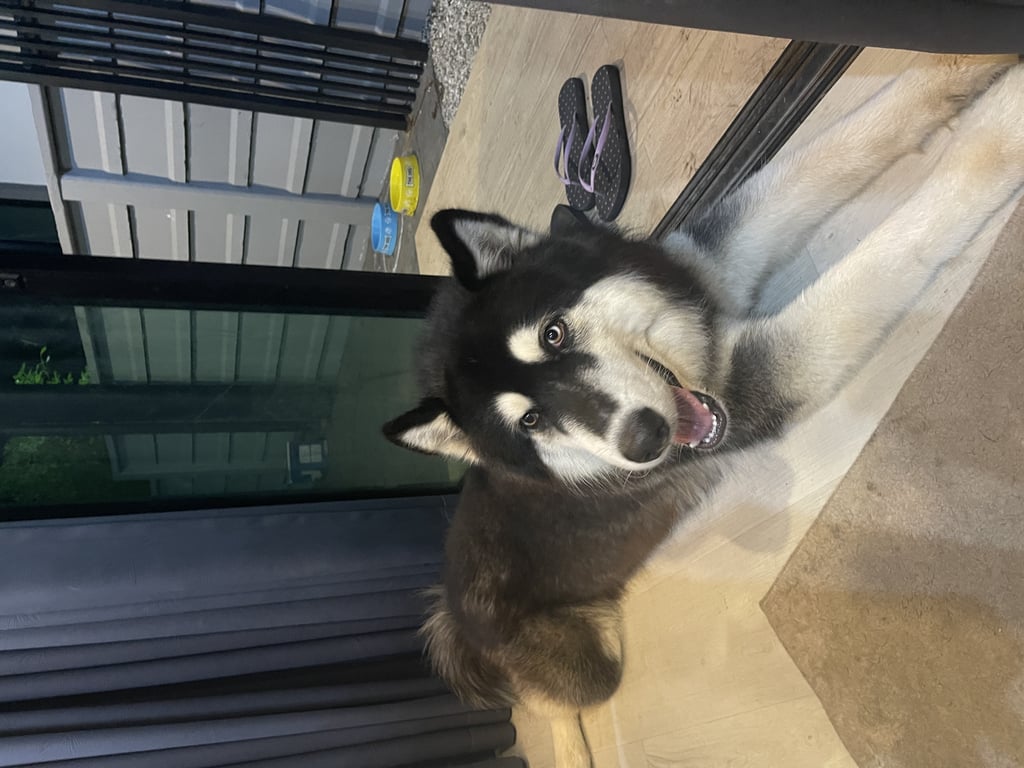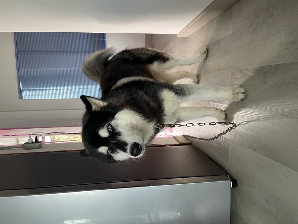 รอยตำหนิ: มีจุดสีดำที่ลิ้น มีโซ่จูงยาว 1.5 เมตรติดไปด้วยตัวใหญ่ สูง น้ำหนัก 25 กิโล ขนหนา มีโซ่คล้องจองและสายจูงเป็นโซ่ยาว 1.5 เมตรติดไปด้วย