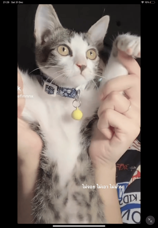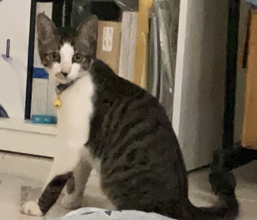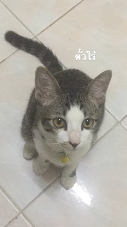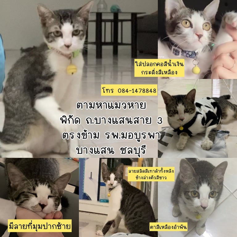รอยตำหนิ: มีลายสีน้ำตาลที่มุมซ้ายของปากตาสีเหลือง ใส่ปลอกคอสีน้ำเงินเข้มกระดิ่งสีเหลือง หางยาว