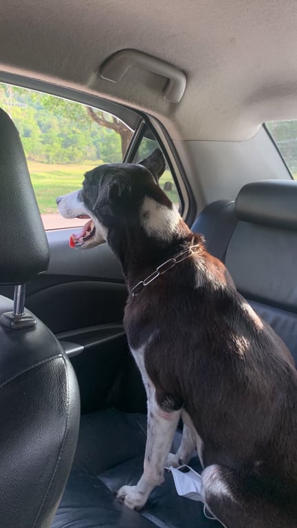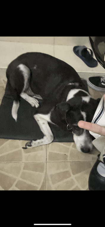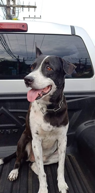 รอยตำหนิ: ใส่ปลอกคอโซ่ ขาหลังเดินไม่ค่อยปกติหางสีดำแต่ตรงปลายเป็นสีขาว มีหงอกเต็มหน้าเพราะน้องค่อนข้างแก่แล้ว