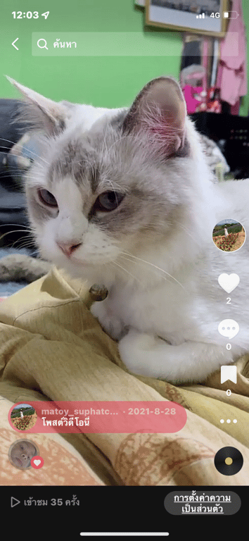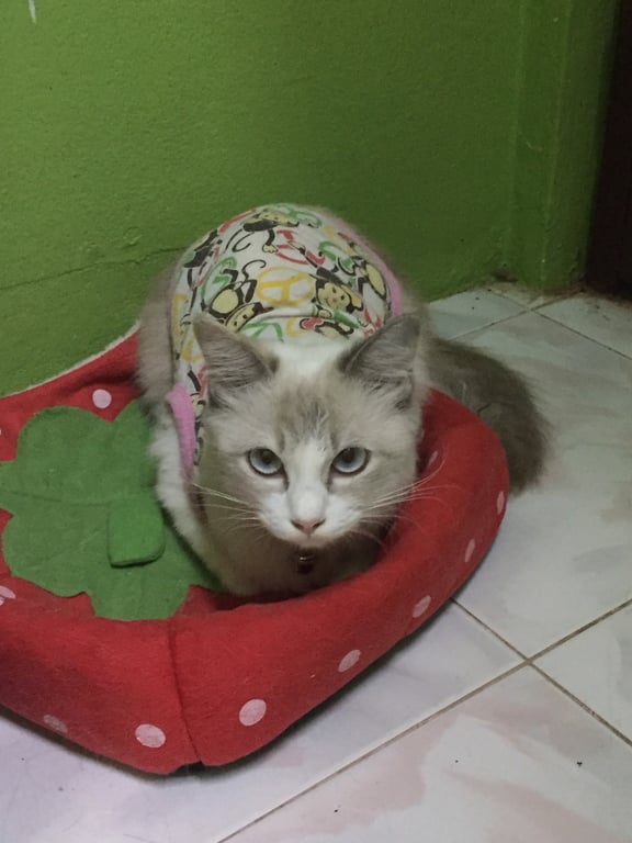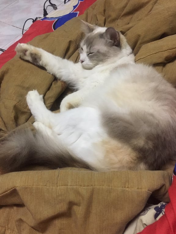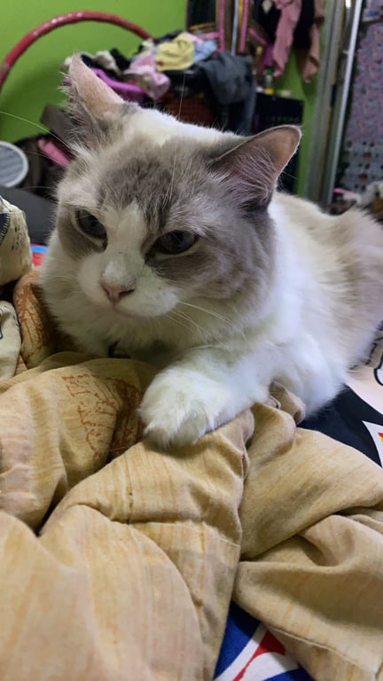 รอยตำหนิ: มีขนฟู ยาว หน้าแหลมแมวไทยผสมเปอร์เซีย นิสัยขี้อ้อน แต่กลัวคนเยอะๆเสียงดัง