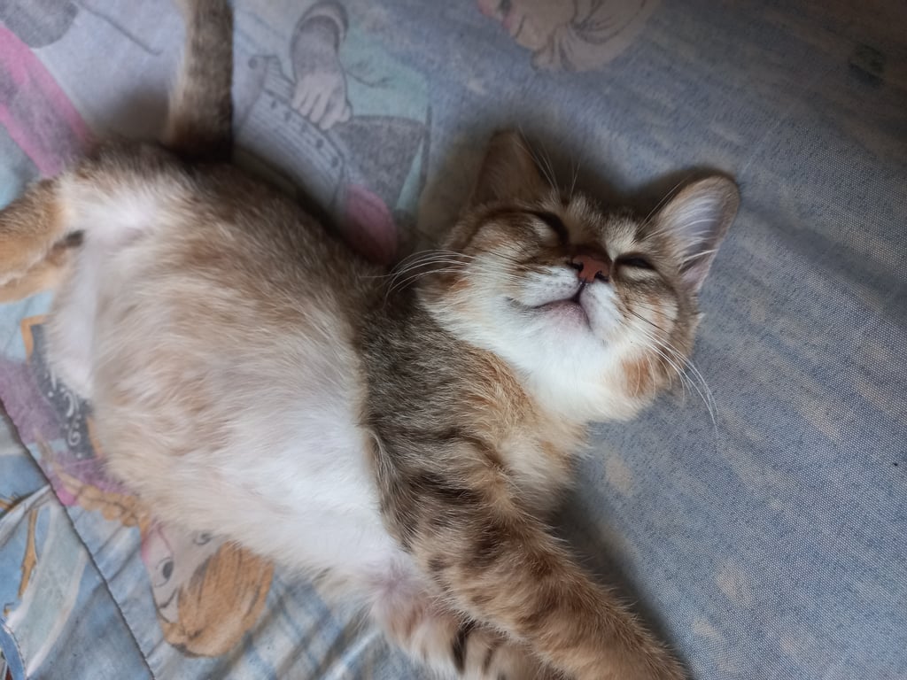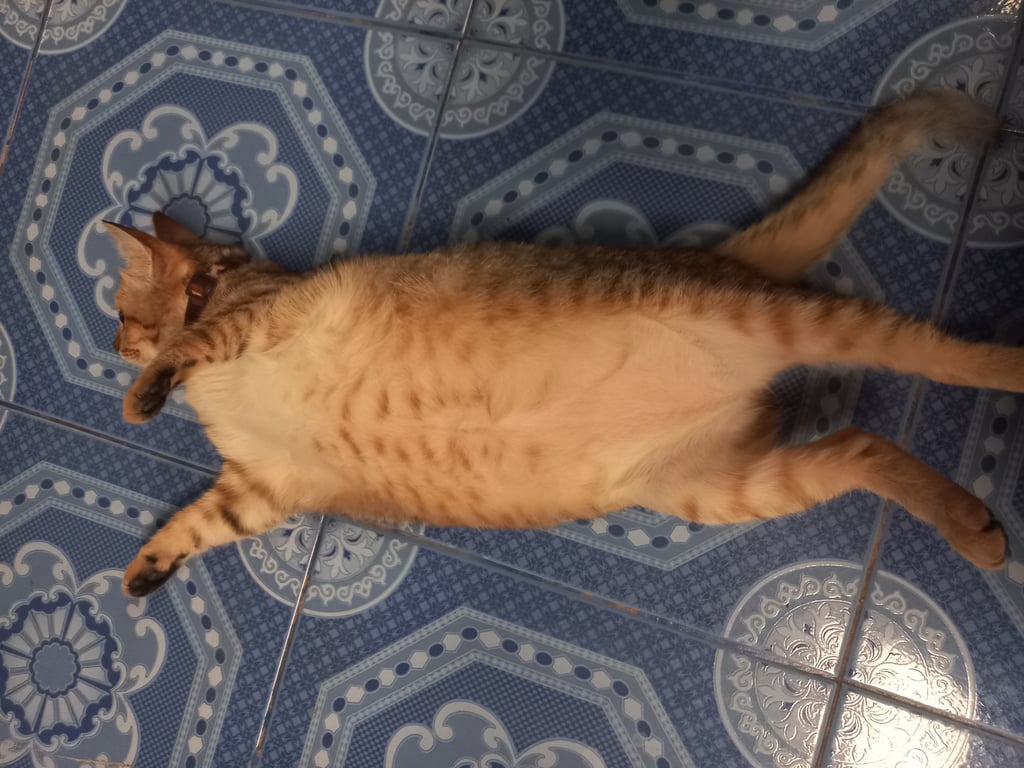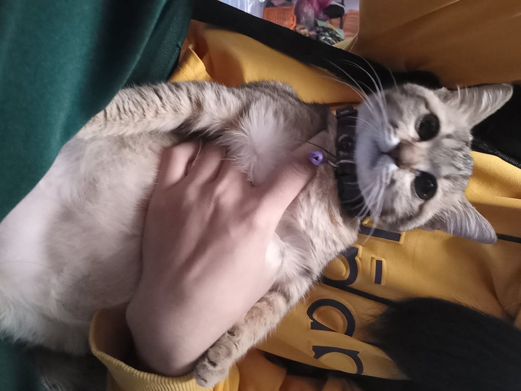 รอยตำหนิ: รายแผลใต้คาง(สิวอักเสบใต้คาง)น้องไม่เคยออกจากบ้าน ตัวอ้วน ขาสั้น ลายปลาสลิด อายุประมาณ10เดือน ไม่ได้ใส่ปลอกคอ ขี้อ้อน หางตาทั้ง2ข้างมีขีดสีน้ำตาล ตรงกลางหลังมีสีดำอ่อนๆ