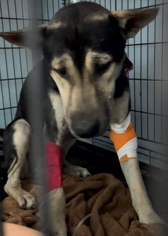 รอยตำหนิ: หาม้วน มีผ้าพันแผลที่ขาหน้า2 ขาปลอกคอสีชมพู ตัวสีดำ หน้าขาวเหลือง ขาสีขาว ห้างม้วนขึ้น มีผ้าพันแผลที่ขาหน้าทั้งสอง