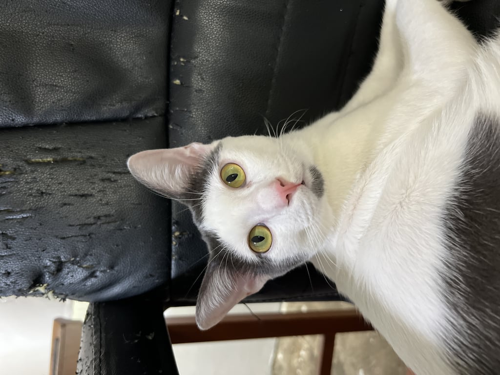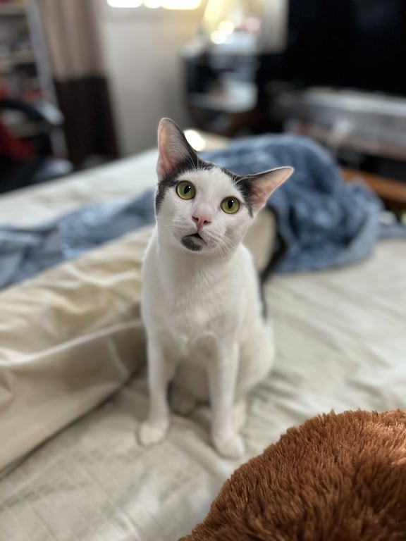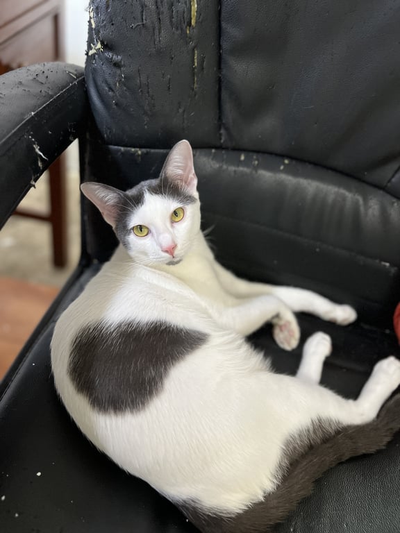 รอยตำหนิ: หางกวัก หน้าตอบ ตาสีเขียวเหลืองลายบนหัวเป็นรูปคล้ายผมแสกกลาง มีลายจุดตรงคาง นิสัยน้องไม่ดุ เป็นมิตรมาก ชอบเข้าหาคน ช่างพูด