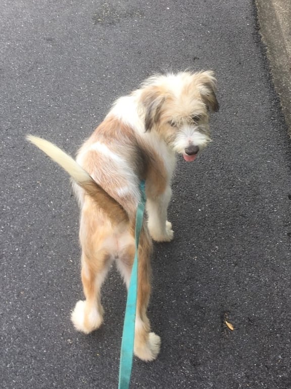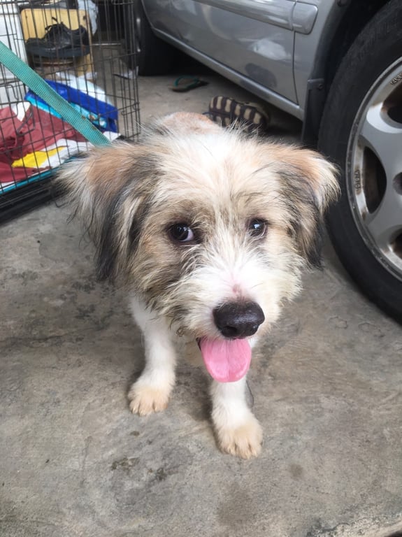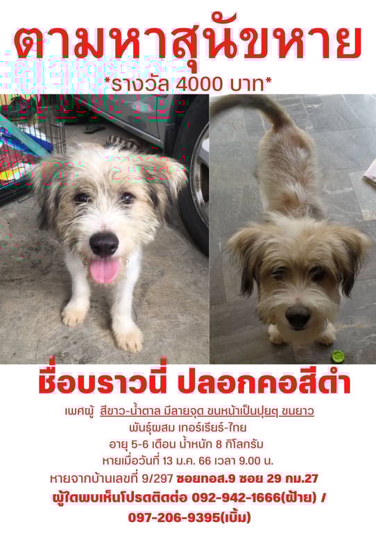 รอยตำหนิ: ตัวเล็กประมาณเข่า ขนยาว หางยาว ใส่ปลอกคอสีดำ