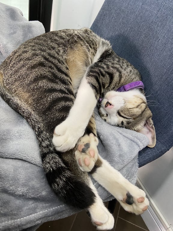 รอยตำหนิ: ถุงเท้าขาว หน้าแต้มขาวเหมือนโดเรม่อน ปาก จมูกมีแต้มสีนำ้ตาล ปลอกคอสีม่วง กระดิ่งสีเหลือง