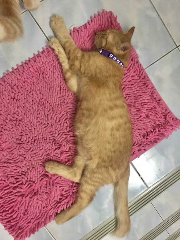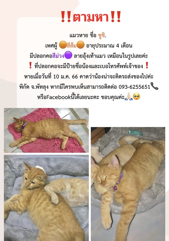 รอยตำหนิ: น้ำหนักประมาณ 2 กก. ตาสีเหลืองผสมส้ม มีปลอกคอสีม่วงลายอุ้งเท้าแมว มีป้ายชื่อแมวและเบอโทรศัพท์เจ้าของห้อยที่ปลอกคอ