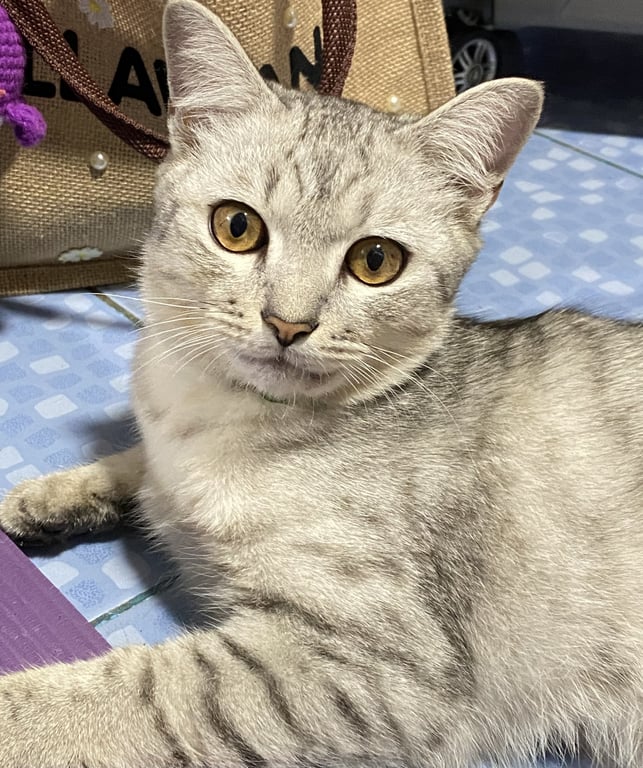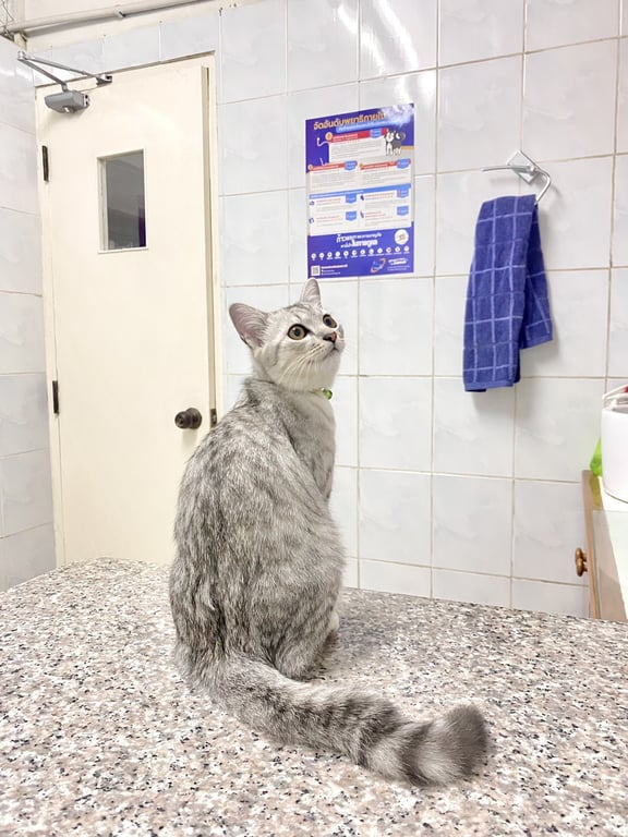 รอยตำหนิ: หางหัก , ล่างปากมีรอยแผลใส่ปลอกคอสีเหลือง กระดิ่งเขียว