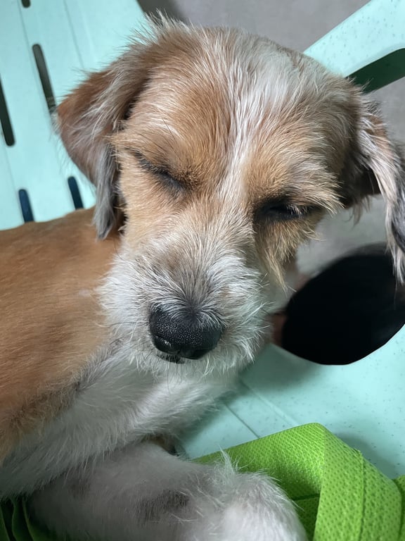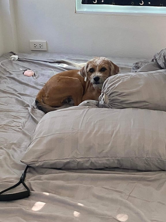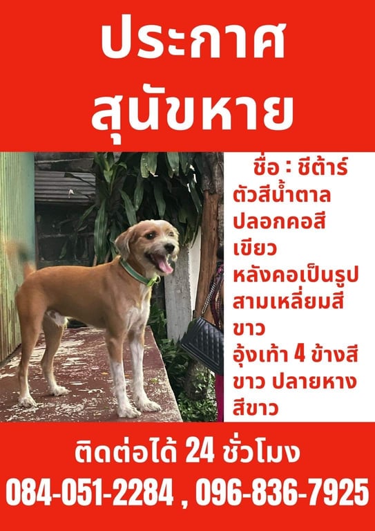 รอยตำหนิ: อุ้งเท้าสีขาว 4 ข้าง หลังคอเป็นรูปสามเหลี่ยมสีขาว ปลอกคอสีเขียว ปลายหางสีขาวน้องเป็นหมาขนสั้น ตัวไม่ใหญ่ หนักประมาณ 11 โล ไม่กัดคน ขี้เล่น ขี้ตกใจ