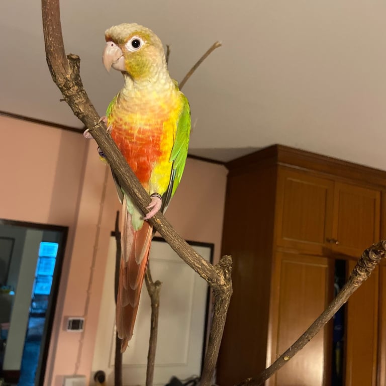 รอยตำหนิ: มีห่วงข้อเท้า2ข้างน้องเชื่องมากกก บินลงไปเกาะคนแน่ๆคะ และที่บ้านมีสุนัข ถ้าน้องเจอสุนัขมีขนน้องน่าจะบินลงไปเกาะเล่นด้วย น้องเรียกชื่อตัวเองได้ ชอบพูดว่า ไอติม