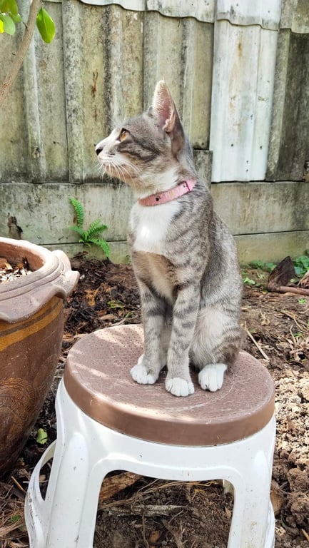 รอยตำหนิ: หางคด ถุงเท้าขาว ลำคอขาว ปลอกคอสีชมพูออกไปเล่นนอกบ้าน แล้วไม่กลับมา
