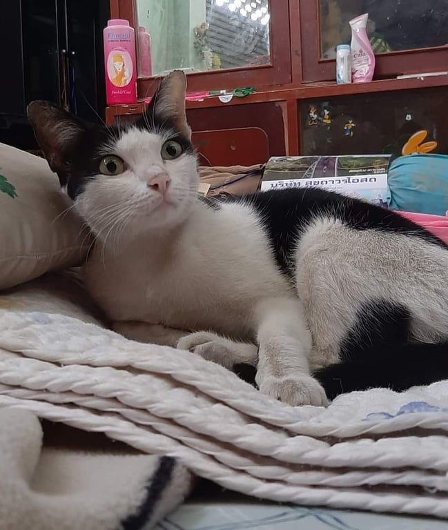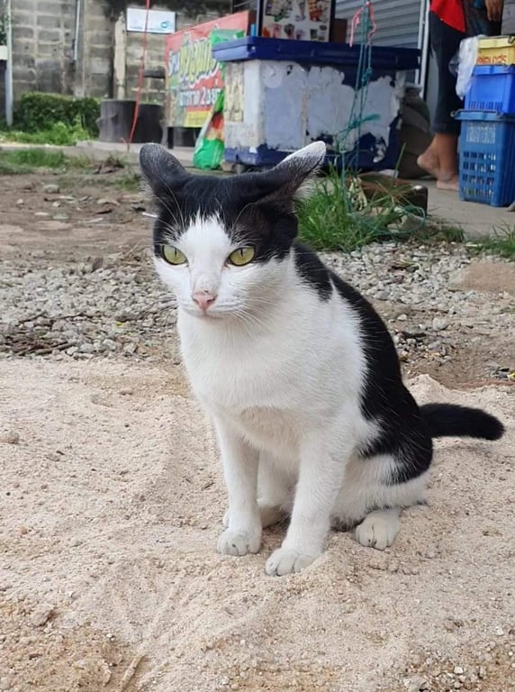 รอยตำหนิ: จมูกสีชมพูอ่อนๆตาสีเหลือง มีปลอกคอสีเหลือง กระดิ่งสีแดง