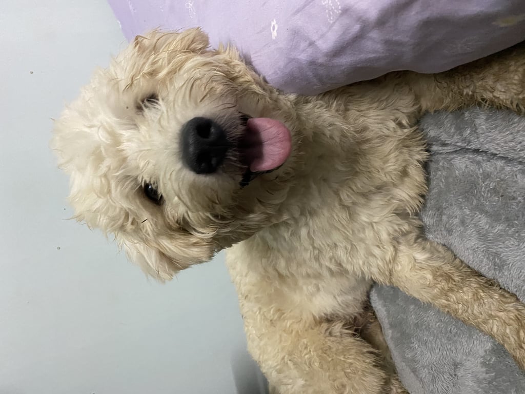 รอยตำหนิ: มีเชือกสีน้ำตาลผูกที่คอน้องขี้กลัว ชอบให้ทำเสียงอ่อนๆเวลาเรียก ให้ลองเรียกว่าข้าวต้มแบบเสียงอ้อนๆ น้องไม่กัดค่ะ