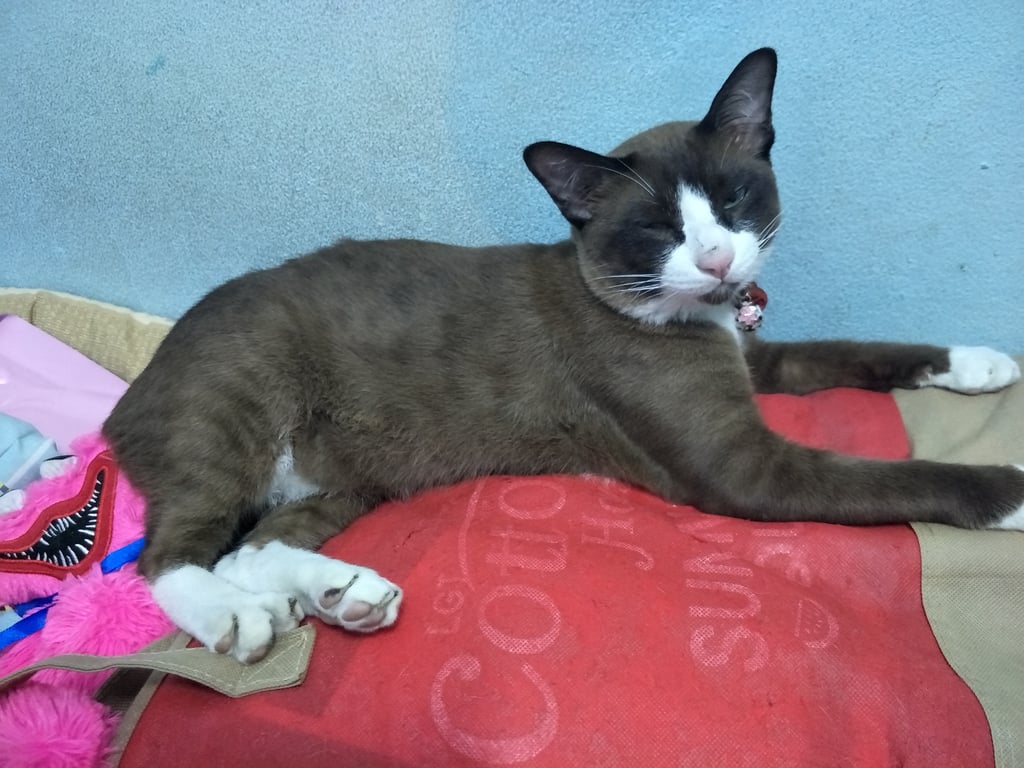 รอยตำหนิ: มีแต้มน้ำตาลใต้คางเหมือนเคราแมวจำชื่อตัวเองได้ ขี้กลัว ตัวอวบๆ ใส่ปลอกคอสีขาวยี่ห้อpetkit
