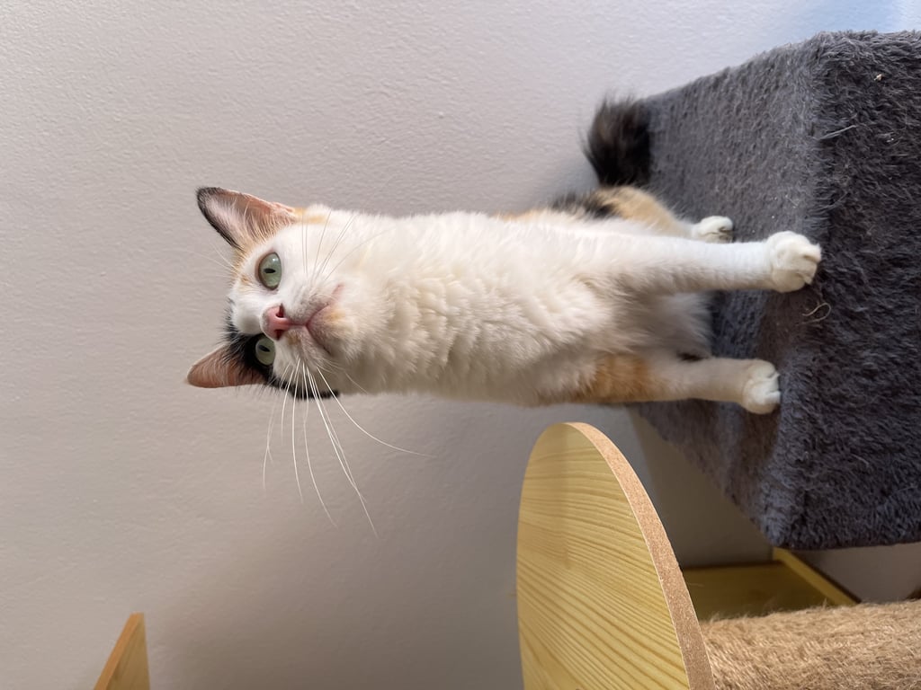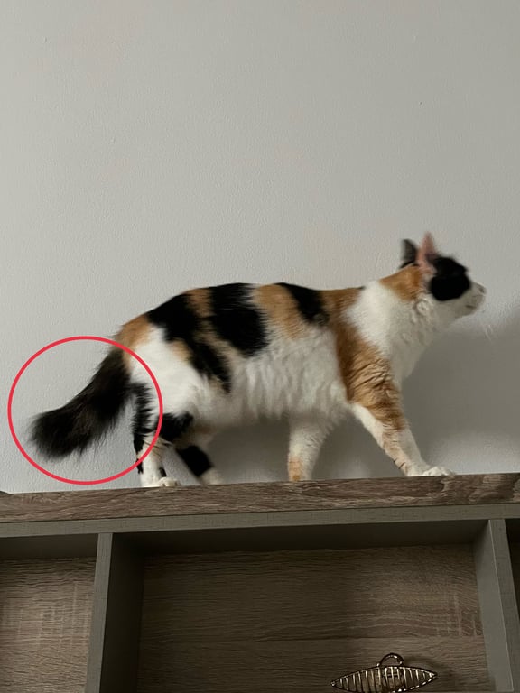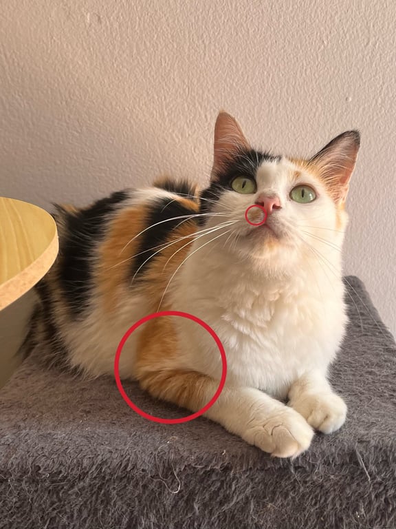รอยตำหนิ: ไฝสีส้มตรงปาก,ลายสีส้มตรงแขนซ้าย,หางฟูสั้น