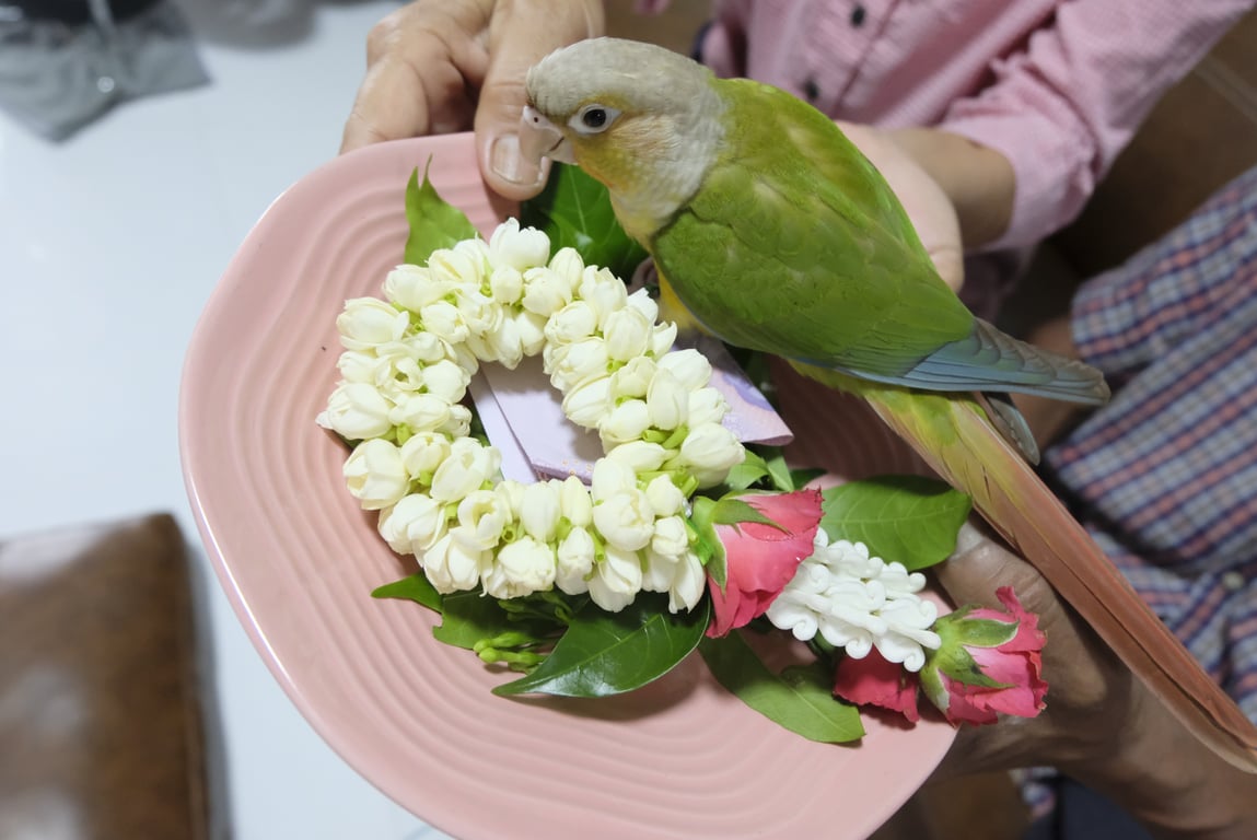 รอยตำหนิ: มีห่วงขาสีเขียวทเขียนชื่อและเบอร์โทรเป็นนกที่ค่อนข้างเชื่อง ติดคนมาก บางครั้งเรียกแล้วจะมาขึ้นมือ