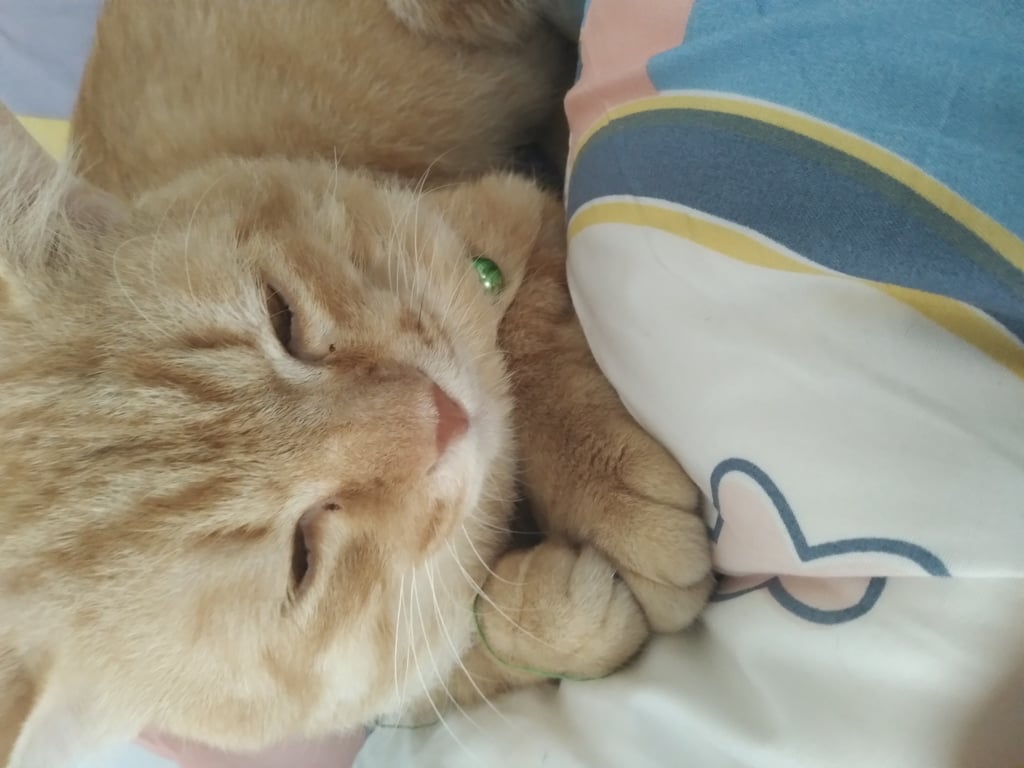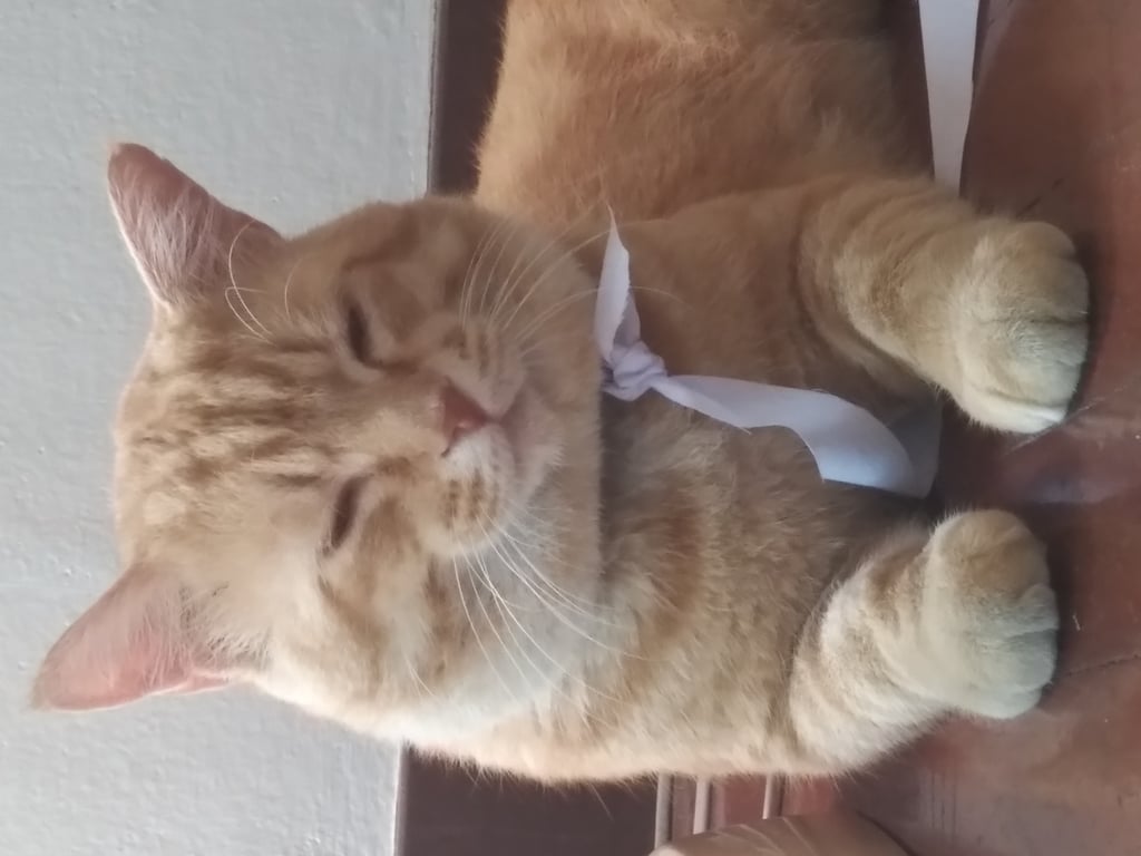 รอยตำหนิ: หางกวัก อ้วนมาก ตาสีเหลือง ปลอกคอสีน้ำเงิน กระดิ่งชมพู