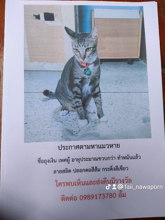 รอยตำหนิ: มีปลอกคอสีส้ม มีป้ายชื่อและเบอร์เจ้าของ มีถุงเท้าที่ขาทั้ง4 หางหักงอตรงกลางน้องขี้กลัวคน