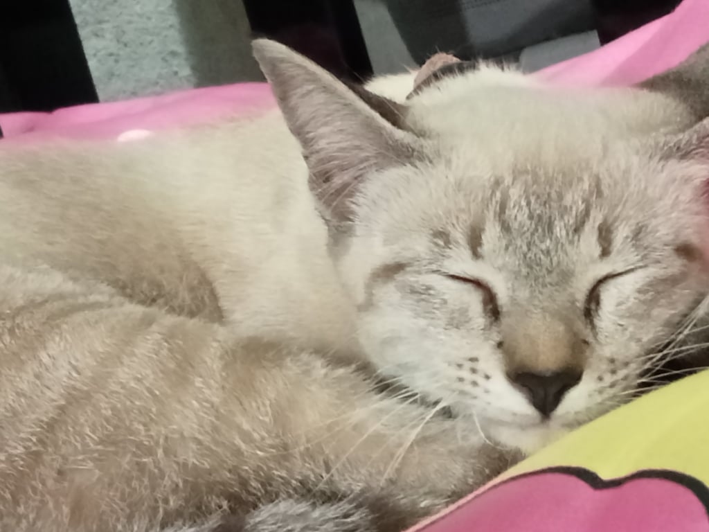 รอยตำหนิ: มีลายที่ต้นขาและหน้าผากมีปลอกคอสีชมพู ตาสีฟ้า