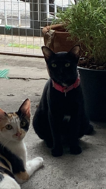 รอยตำหนิ: ตัวไม่อ้วน ขี้กลัวคนมีปลอกคอและกระดิ่งสีชมพู ตัวไม่อ้วน สีดำมีสีขาวบริเวณคอ