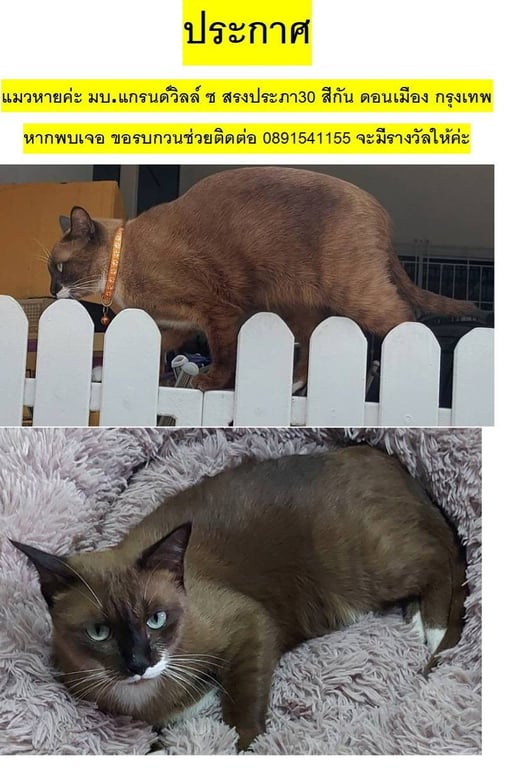 รอยตำหนิ: ปากสีขาวมีปลอกคอสีส่มตอนที่หาย พิกัดสรงประภา 30 มบ.แกรนด์วิลล์ เมืองใหม่ดอนเมือง พลีโน่ และละแวกใกล้เคียง