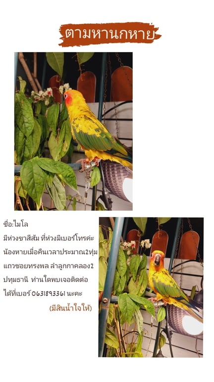รอยตำหนิ: มีห่วงสีส้มที่ขา ที่ห่วงมีเบอร์โทร