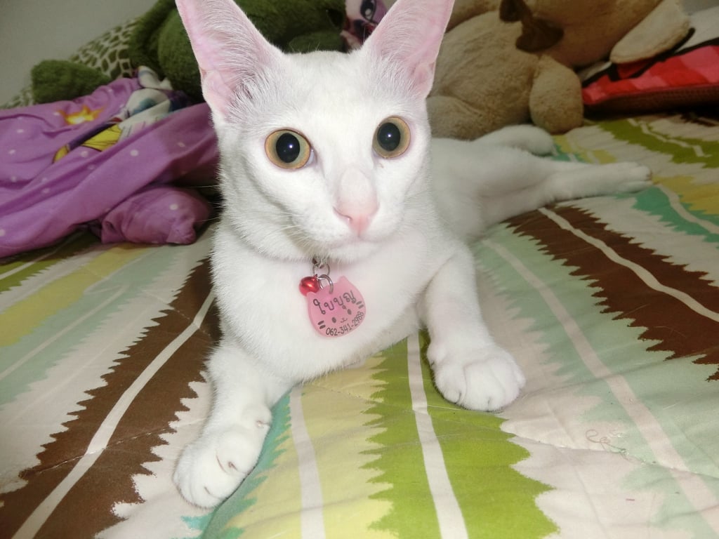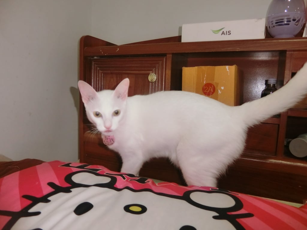 รอยตำหนิ: สีขาวล้วน ปลายหางน้องจะออกสีเหลืองน้องกลัวคน กลัวเสียงดัง (มีรางวัลให้กับผู้พบเจอ)