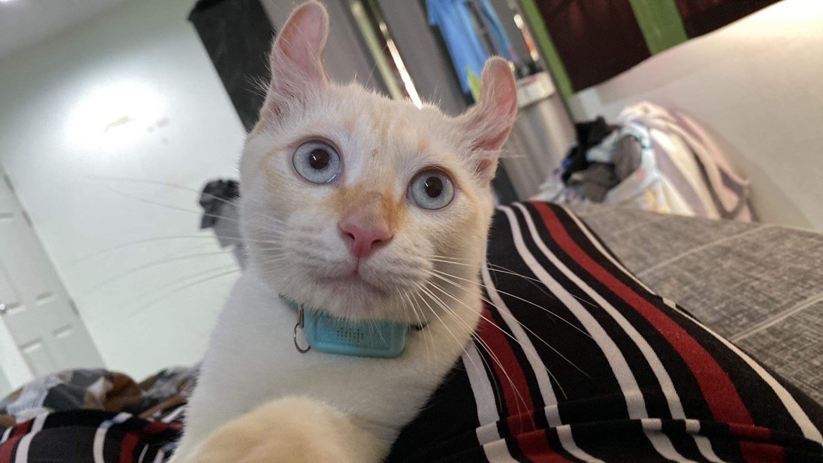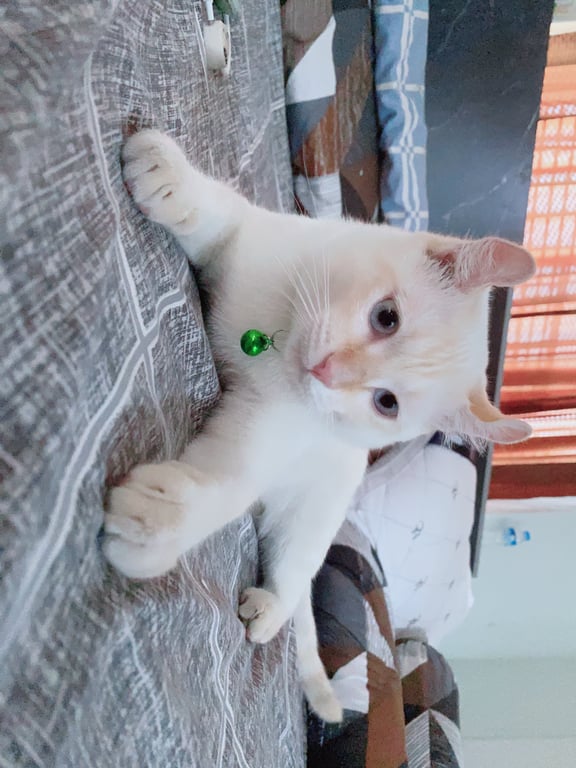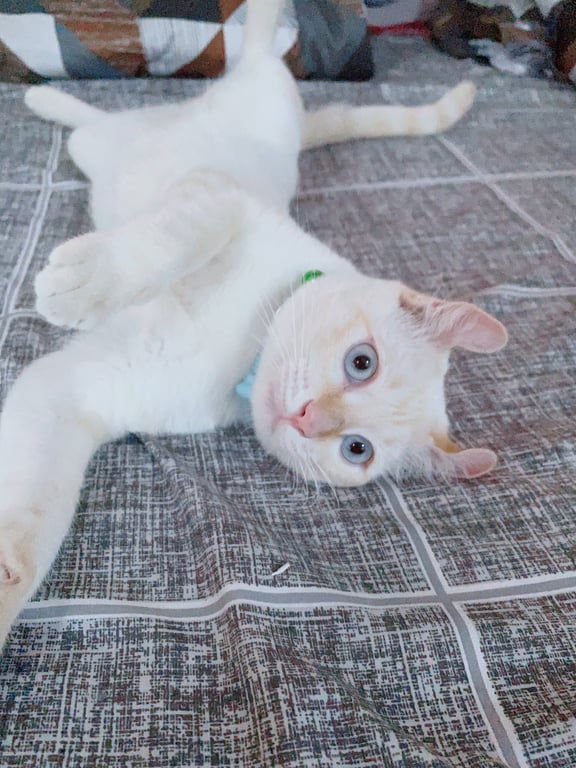 รอยตำหนิ: หูบิดเป้นแมวสีขาว หางลายส้ม หูบิด ตาฟ้า