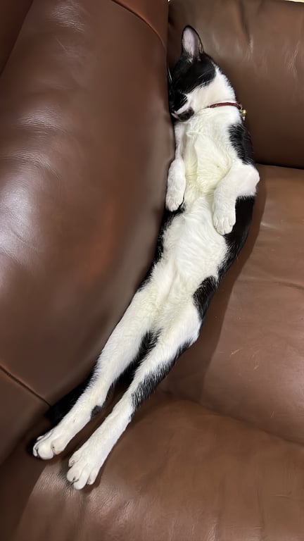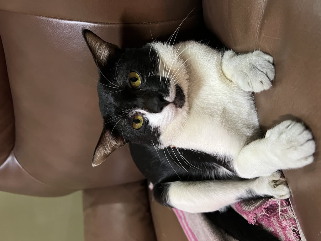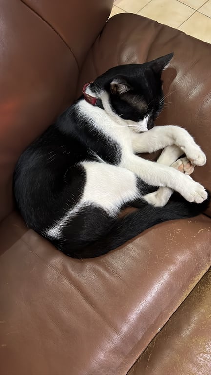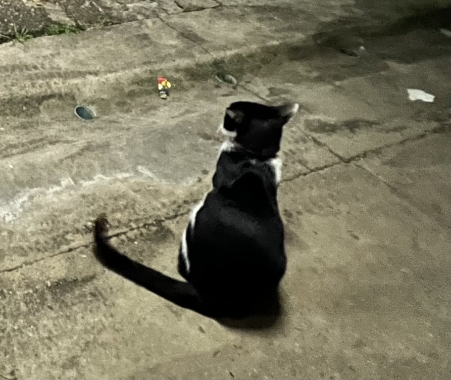รอยตำหนิ: ขาหลังทั้งสองข้างมีรอยขีดยาวสีขาว จมูกและแก้มซ้ายดำ แก้มขวาขาว ท้องสีขาวล้วน มองจากด้านหลังดำทั้งหมดแต่ช่วงคอมีสีขาวคล้ายสวมหมวกกันน็อคปลอกคอลายสก็อตสีแดงขาว ไม่มีกระดิ่ง
