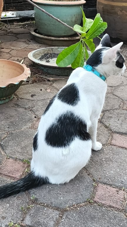 รอยตำหนิ: หน้าฝั่งขวาสีดำ ขาซ้ายหน้ากับขาซ้ายหลังมีจุดดำ ลำตัวฝั่งขวามีลายหัวใจสีดำกลับหัวหางดำทั้งหมด