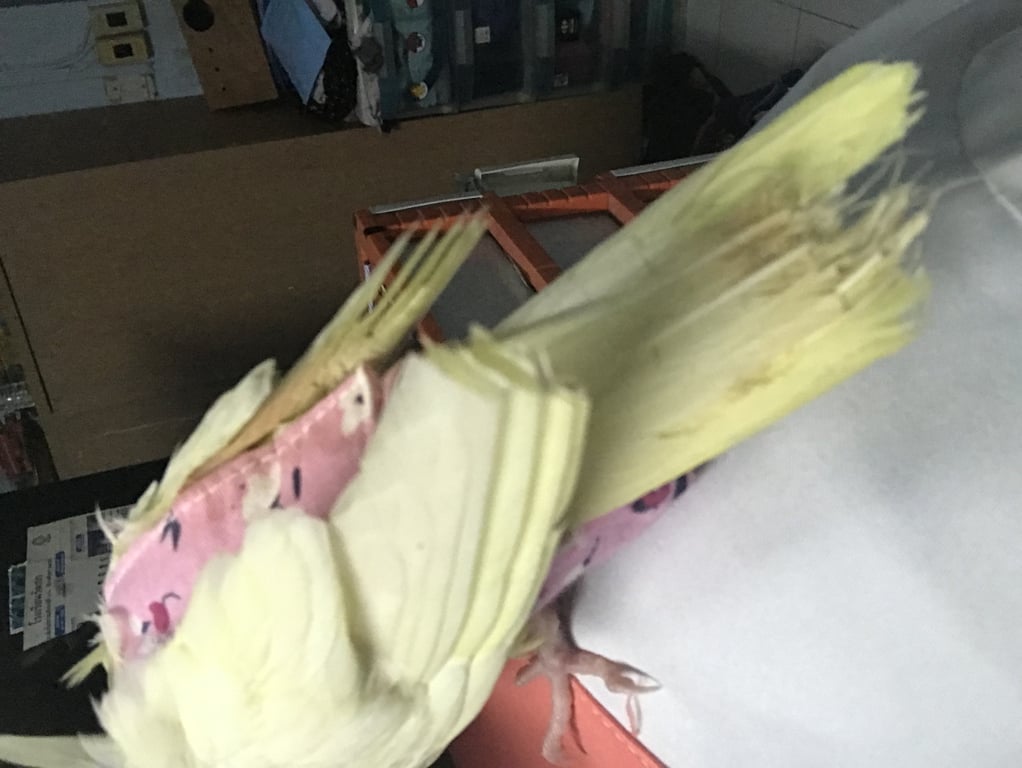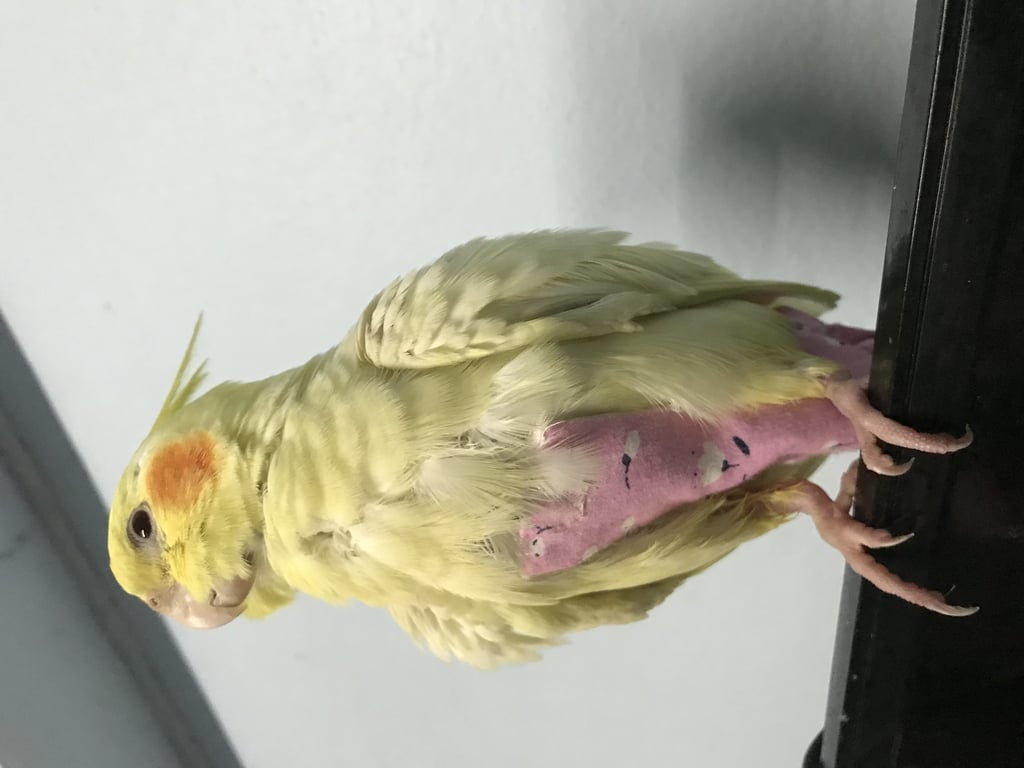 รอยตำหนิ: หางมีรอยตัด ขามีนิ้วไม่ครบ มีเเผลที่เท้าลักษณะขนหางมีรอยไหม้และรอยตัด ใส่ชุดผ้าอ้อมสีชมพู
