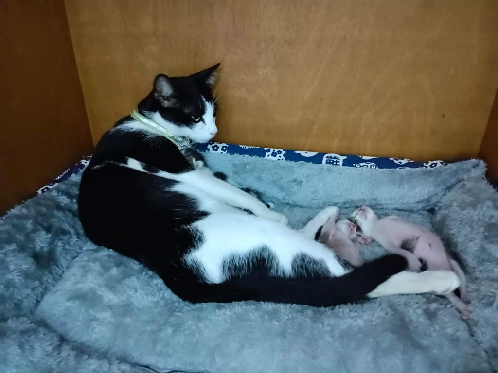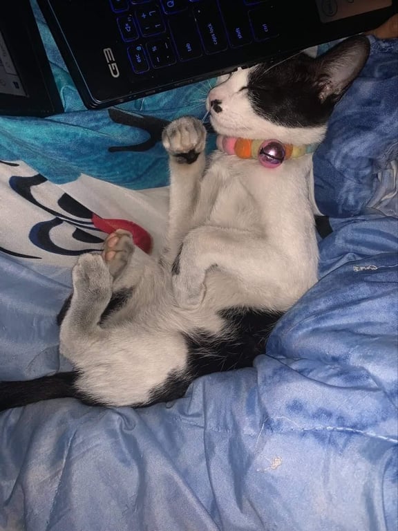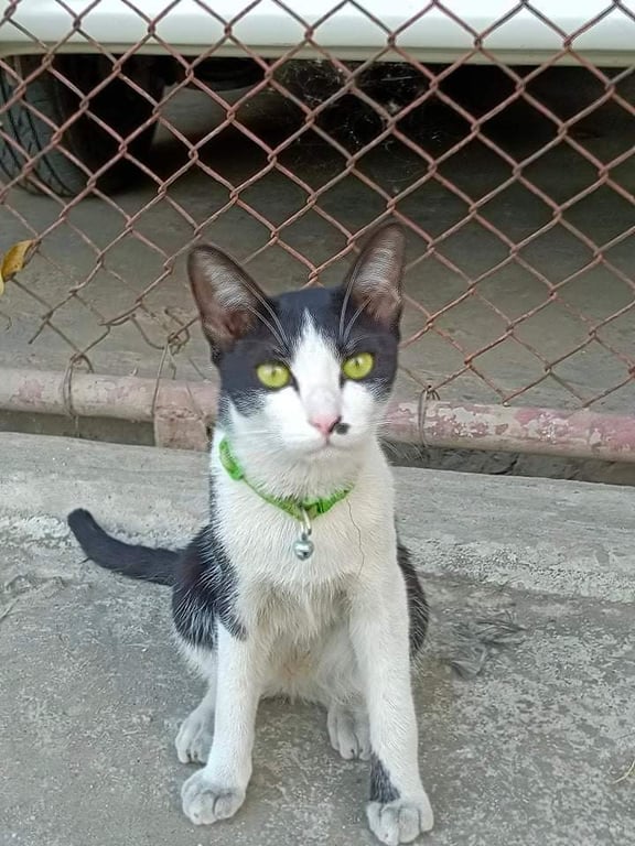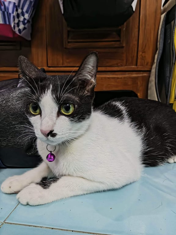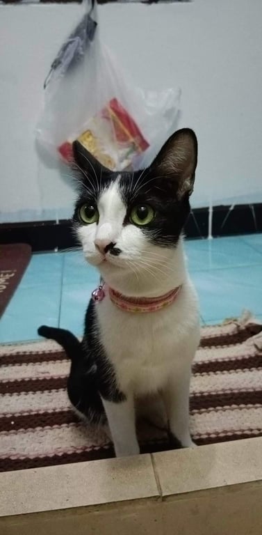 รอยตำหนิ: มีไฝสีดำข้างจมูกด้านซ้าย หางยาวตรงใส่ปลอกคอสีชมพูลายดอกไม้มีกระดิ่ง น้ำหนัก3.2kg.