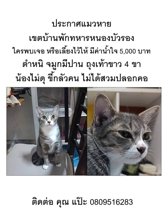 รอยตำหนิ: จมูกเป็นปาน ถุงเท้าขาวสีขาไม่ใส่ปลอกคอ หางยาว