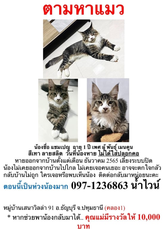 รอยตำหนิ: น้ำหนัก 6-7 กิโล อายุ 1 ปี โครงสร้างใหญ่น้องไม่มีปลอกคอ ขี้กลัว ฉลาดมากๆ ถ้าเจอคนที่รู้สึกปลอดภัยเขาจะกล้าเข้าหา