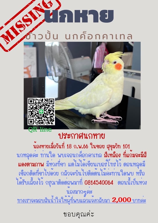 รอยตำหนิ: มีข้อเท้า และ มีเชือกติดไปด้วยตอนหลุดหลุดที่ หมู่บ้านเมืองทอง ซอย 7 วันที่ 18 ก.พ. 66 ในซอย สุขุมวิท 101 ที่ห่วงน้องคือมีเชือกติดกับห่วงที่ขาไปด้วยกลัวจะพันกับต้นไม้